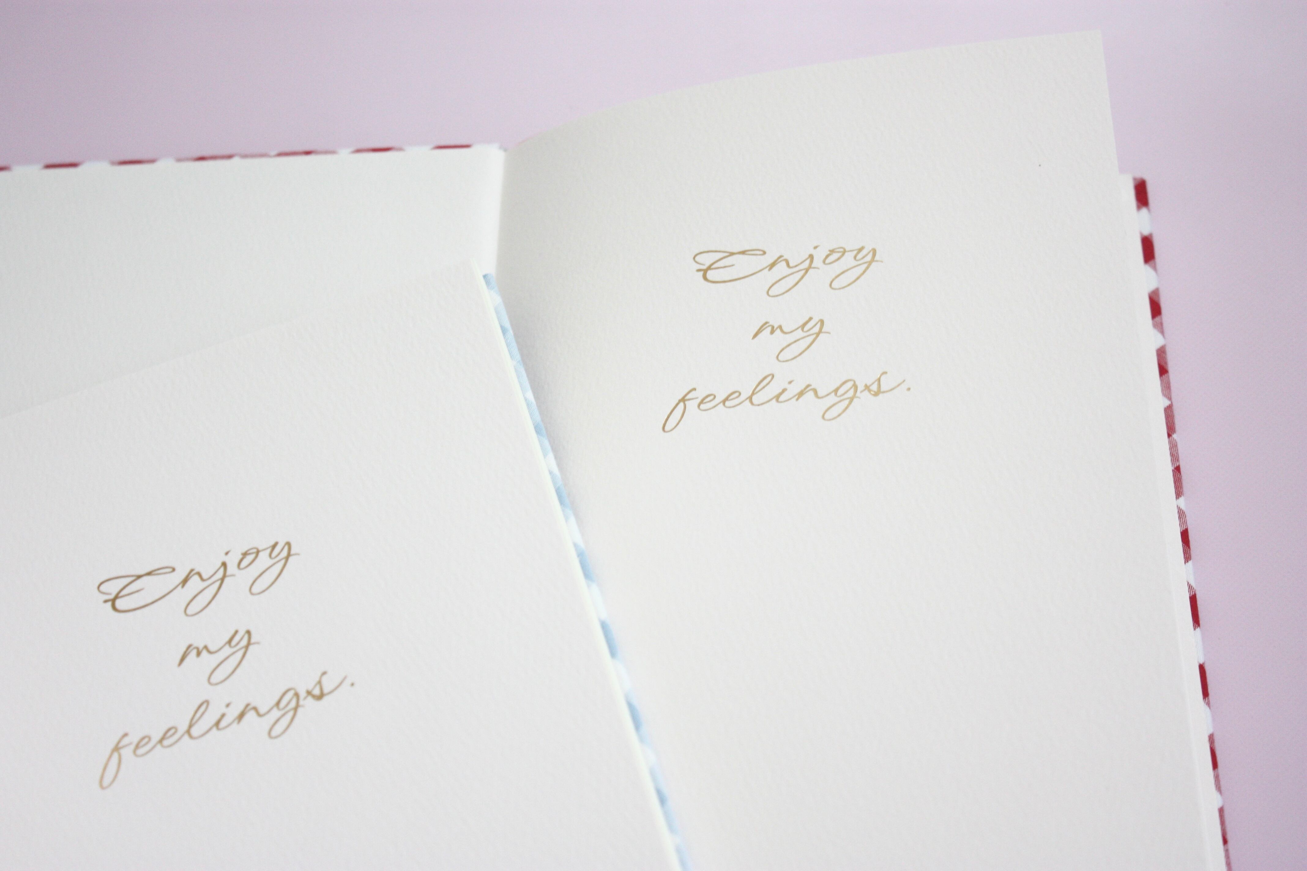 見返しには「Enjoy my feelings」の箔押しを施して、開くたびに癒され、楽しさが溢れ、励まされることをイメージして作りました♡