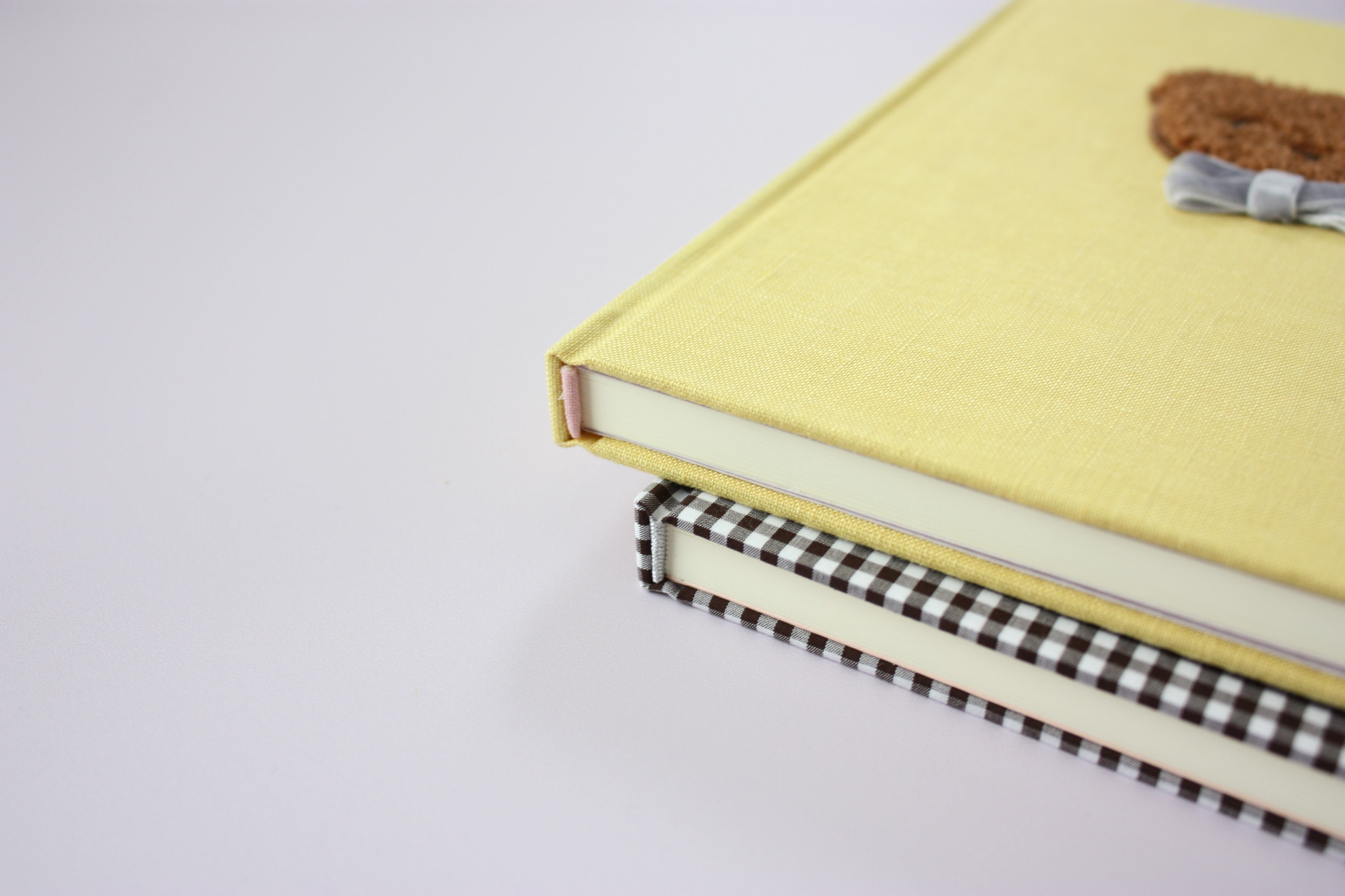 ノートの角の飾り布はピンクの生地を、ノートの見返しにはラベンダーの紙を使い、